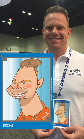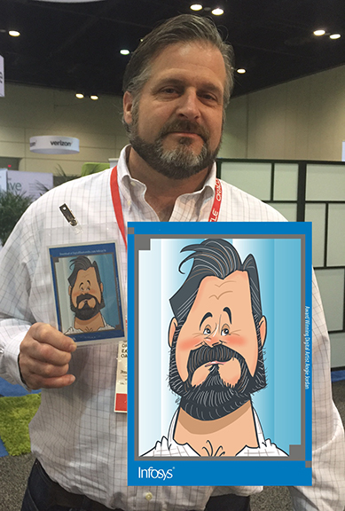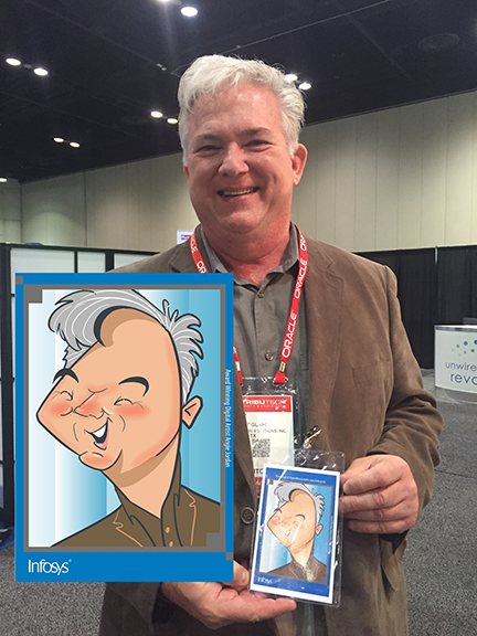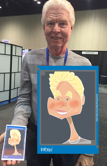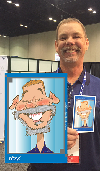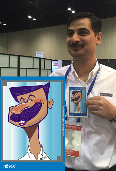 The next day, 1st day of conference with infosys started out a very busy day and the lines never stopped. I had many good and excited faces to show, below, and the attendees were thrilled to have their cartoon created to use as an avatar on the latest social media.